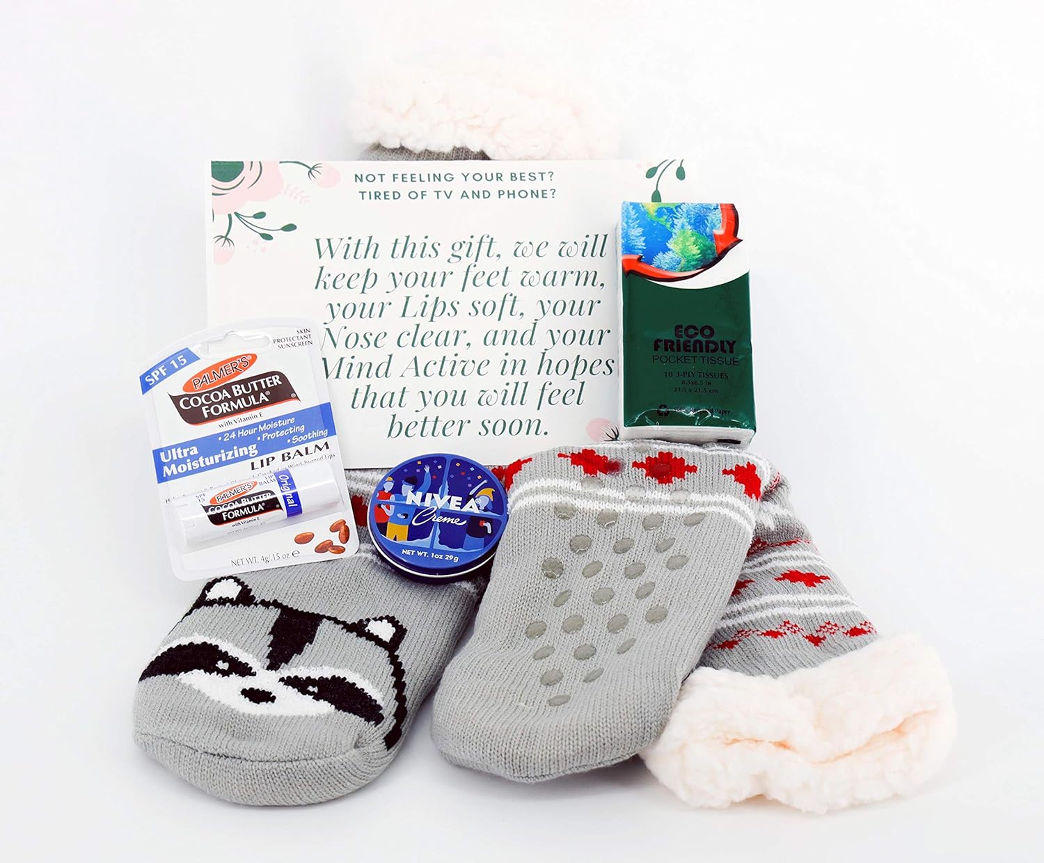 Feel Better Soon Care Package baskets for a patient recovering from sickness, flu, Covid, surgery, injury, cancer, depression. This care package for women is the perfect gift to show you are thinking of them and wishing them well. A Get Well message is included with your gift. The Card reads “With this gift, we will keep your feet warm, your Lips soft, your Nose clear, and your Mind Active in hopes that you will feel better soon.”