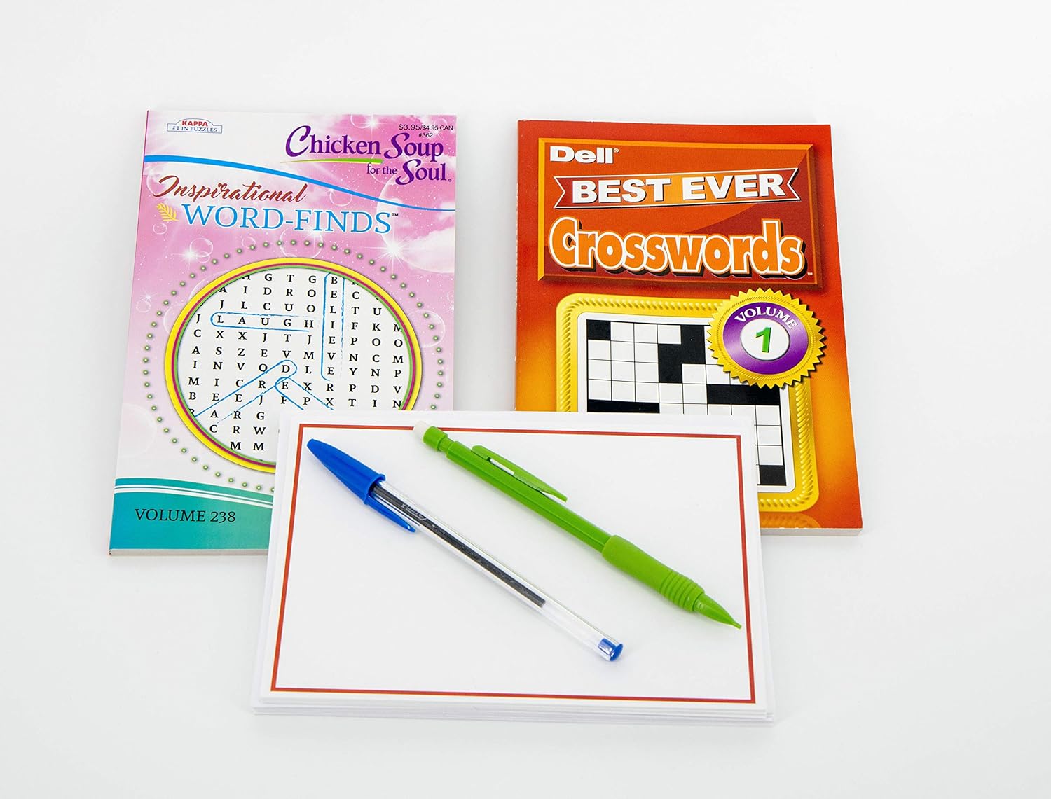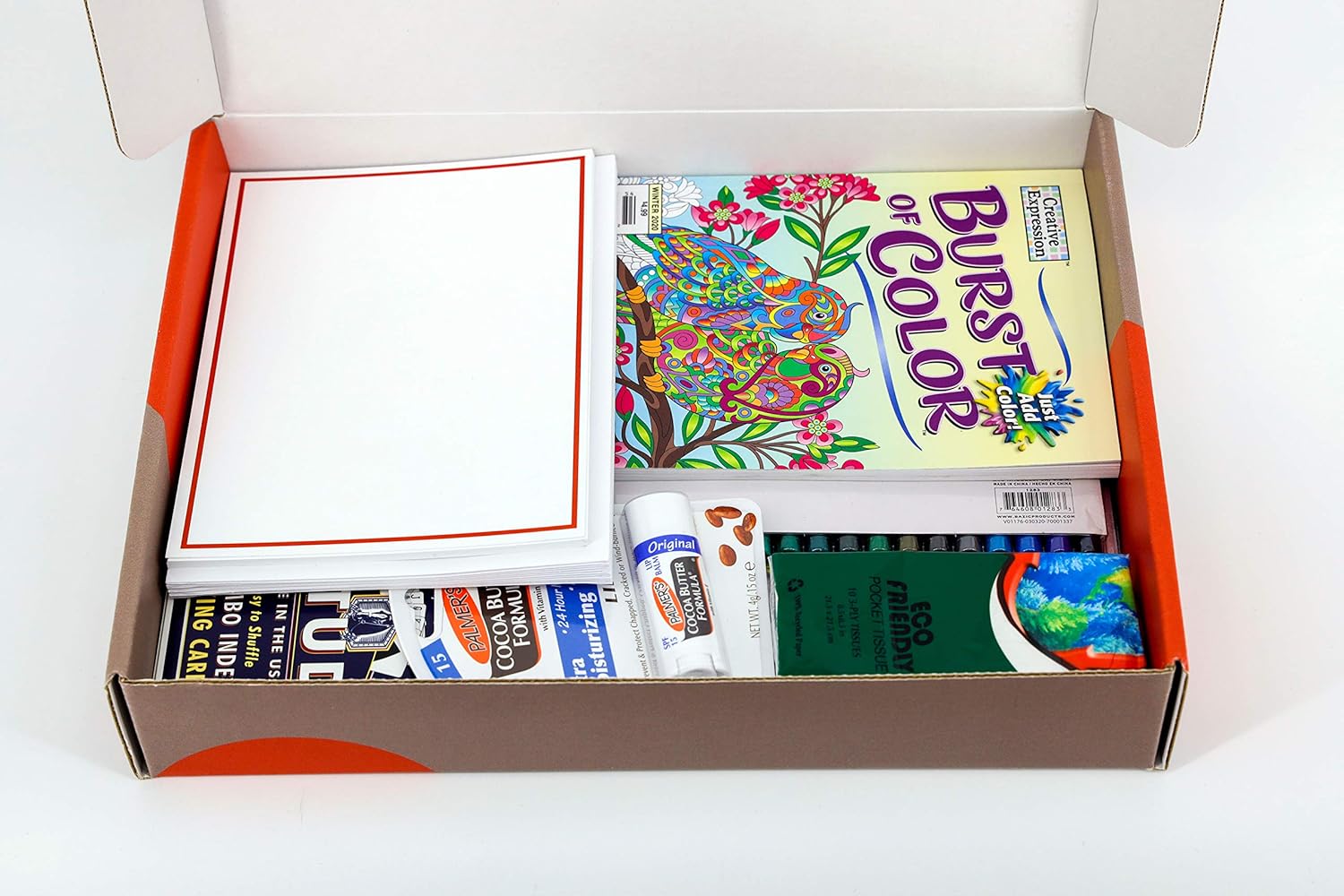 Get well soon Activities Box Care Package for women. Beat the Boredom of sickness at home, hospital, nursing home, or assisted living with Active Hands and Active Minds to assist in feeling better. Items include fuzzy women’s non slip socks, lip balm, travel hand cream, and travel tissue. Other activities include personal note cards and envelopes to reach out to others, adult coloring books, word search book, crossword book, playing cards, and accessories. The perfect gift for the sick, injured, or someone in your life that you want to help feel better and needs something more to do and a way to reach others. Each box includes names and addresses of US-based organizations that need kind cards and pictures. Beat the Boredom Box encourages mental stimulation activities and human contact to brighten the day. Know someone who just had surgery, is undergoing cancer treatment, or is home in bed because of an illness? This can help keep their mind active and help them relax