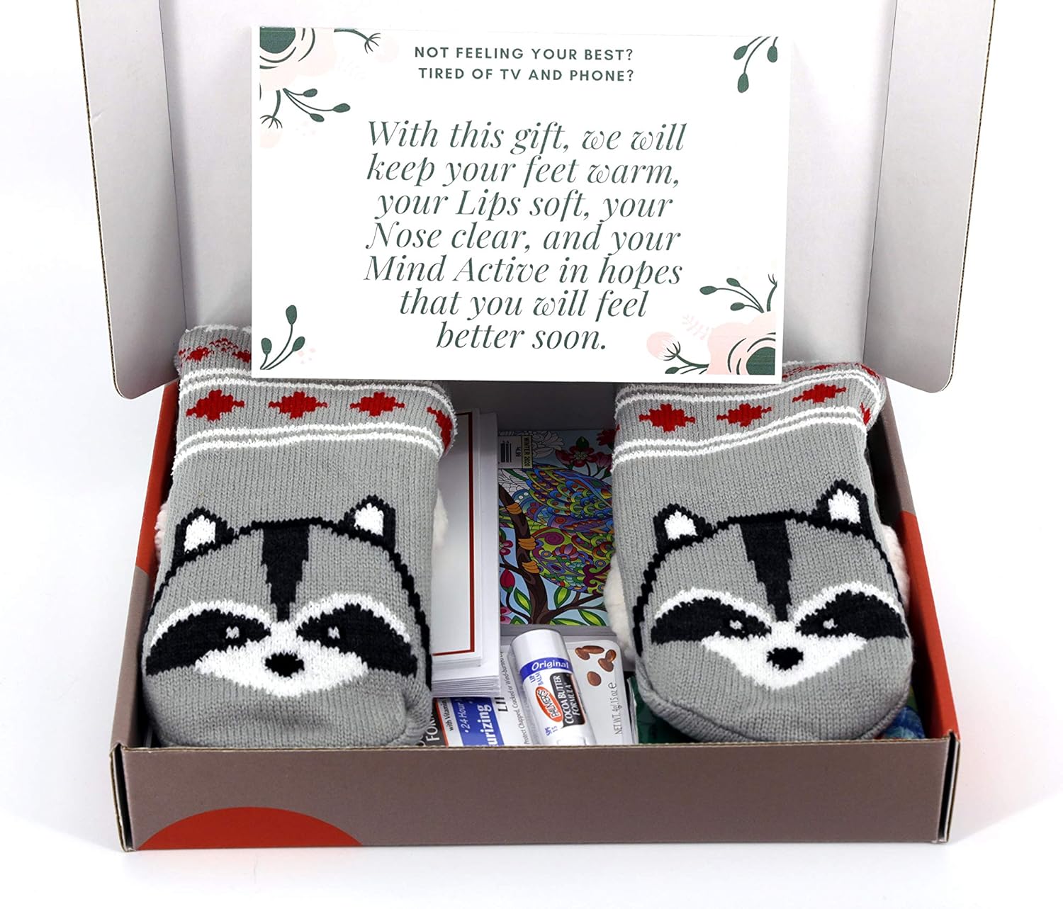 There are other get well soon gifts for women that offer food products. We have chosen not to include these items for safety and health reasons. Feel better gifts for women are the perfect non-food care package for women that include cute fuzzy socks for women that have animal faces to keep feet warm.