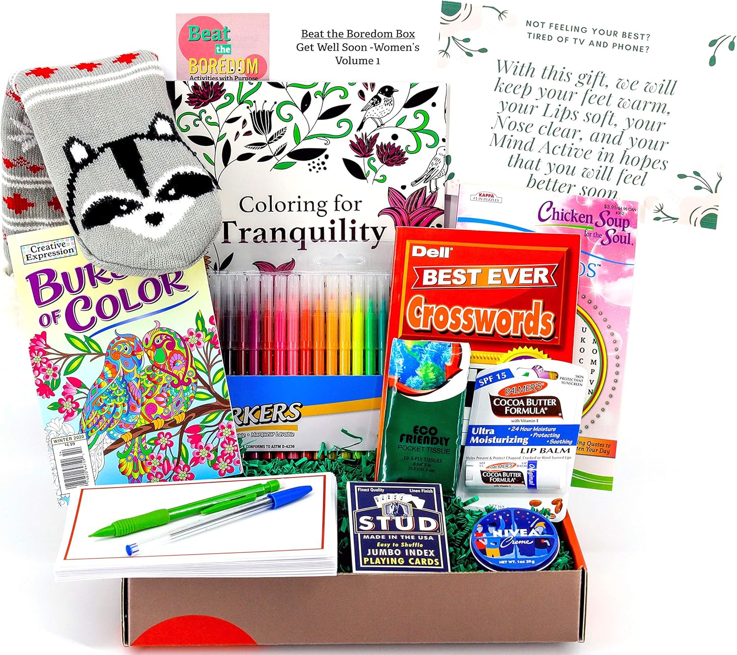 Get Well Gifts for Women Beat the Boredom Box Non Food Gift Basket Get Well Message Plush Non-Slip Socks Lip Balm Travel Tissue Cream Crossword Book Adult Coloring Books Cards Markers, 39 Piece Set