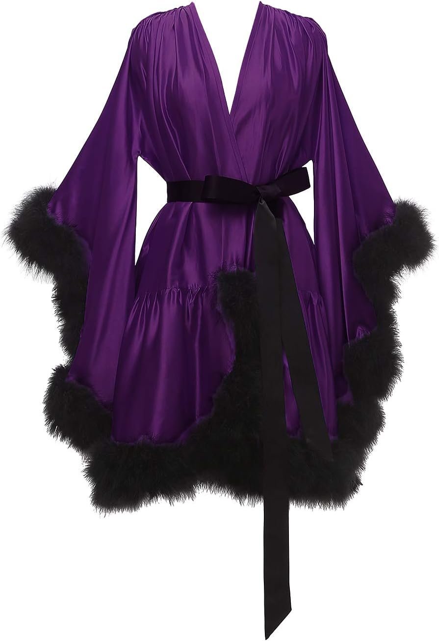 Yexinbridal Feather Fur Robe Silk Satin Bridal Dressing Gown...