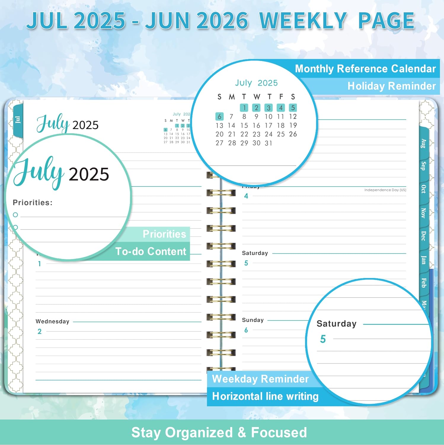 2025-2026 PLANNER – Weekly & monthly planner 2025-2026 covers 12 months from July 2025 to June 2026. Planner 2025-2026 weekly and monthly features full monthly view pages for each month. Separate pages with full weekly view for more detailed planning. Coated monthly tabs and inner pocket make it more convenient for using.