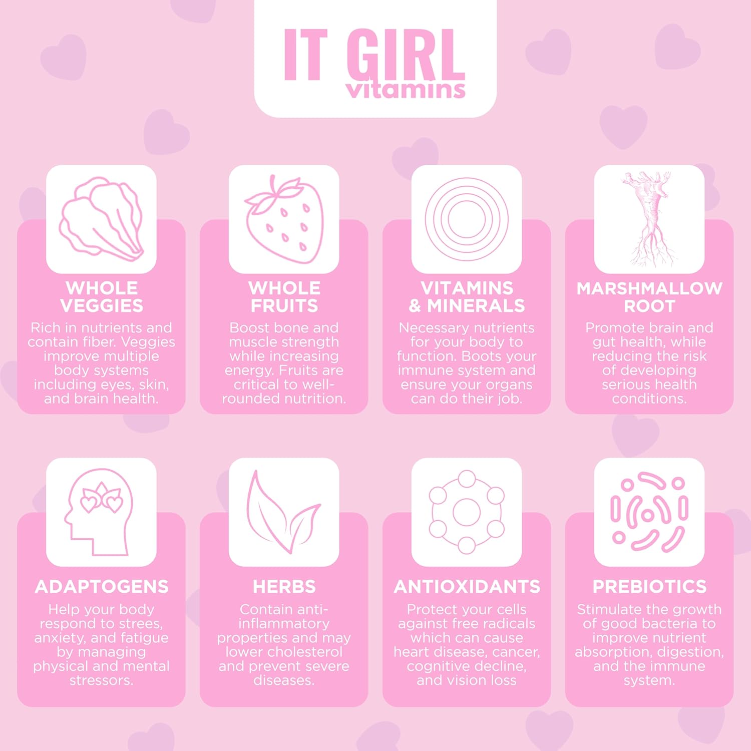 No cutting corners: It Girl Vitamins is plant-based and vegan. Our gummies are free from gluten, dairy, nuts, seed oils, nongmo with no artificial additives and minimal sugar from our organic fruit. Every pack is made with the finest organic whole-food ingredients and produced using the highest quality ingredients from los angeles, california.