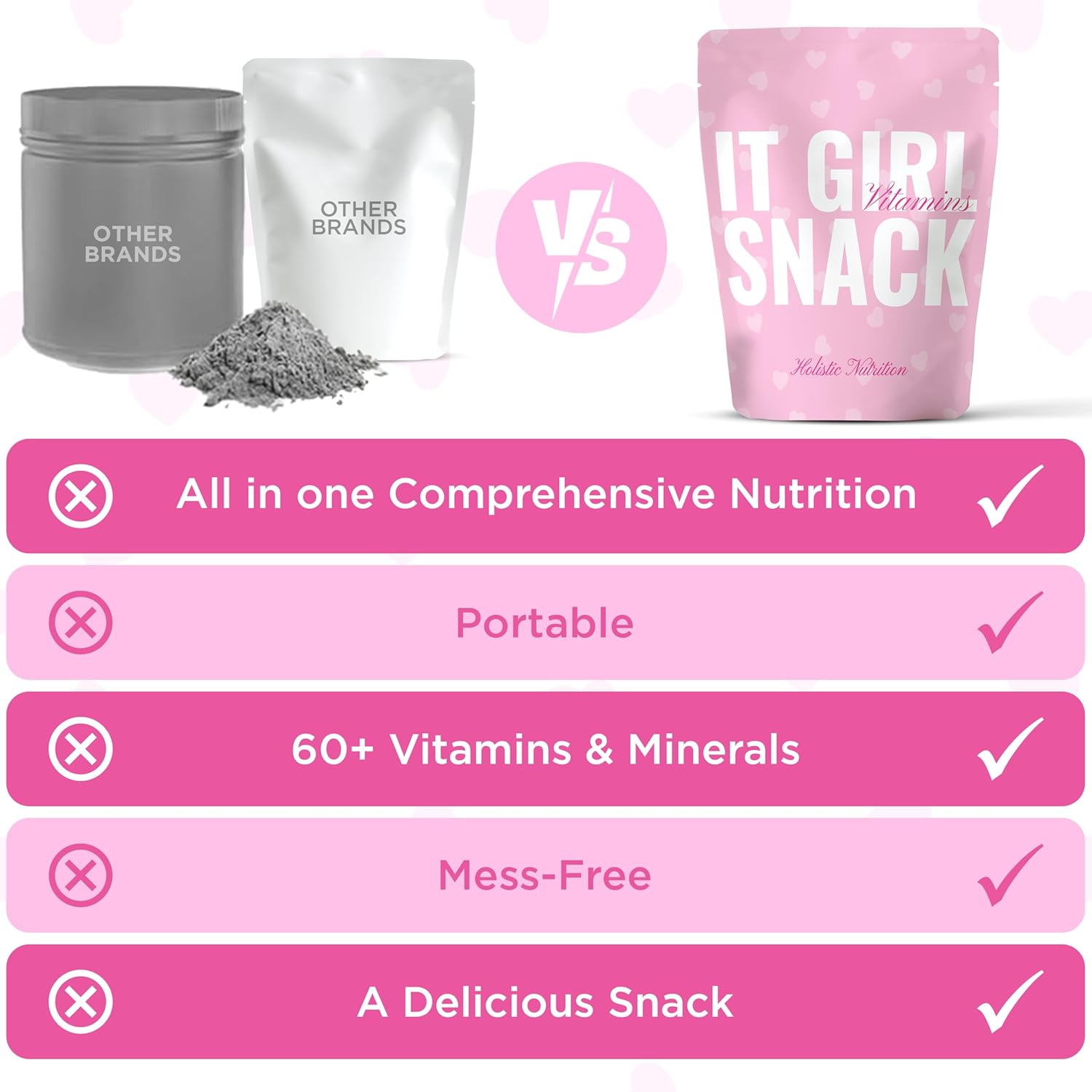 Comprehensive Benefits: The benefits of It Girl Vitamins Snack go beyond just gut health. Imagine saying this all in one breath: gut health, immunity, cognition, reduced bloating, enhanced digestion, focus, balance hormones, increased energy, thicker hair and nails, healthier skin, anti-aging, stress relief, healthy metabolism, recovery, strength, better sleep, and overall well-being.💜