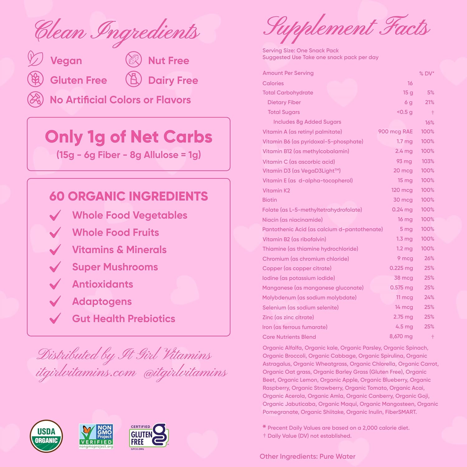 A GUMMY THAT FILLS THE GAP WITH LOVE: It Girl Snack by It Girl Vitamins Super Greens Gummy Bears greens powder snack packs are carefully formulated with *60* potent ingredients that are all organic, vegan, kosher, non gmo, gluten-free, and halal: organic whole fruits, veggies, superfoods, super mushrooms, prebiotics, probiotics, adaptogens, antioxidants, herbs, vitamins & minerals to offer effective nutrition in one delicious daily snack. The ingredients in this fresh, light strawberry/sweet green flavored gummy (now available in 2 flavors) can help improve your gut health, brain health, beauty, hormone balance, cellular nourishment, support immunity, promote healthy bones, focus.