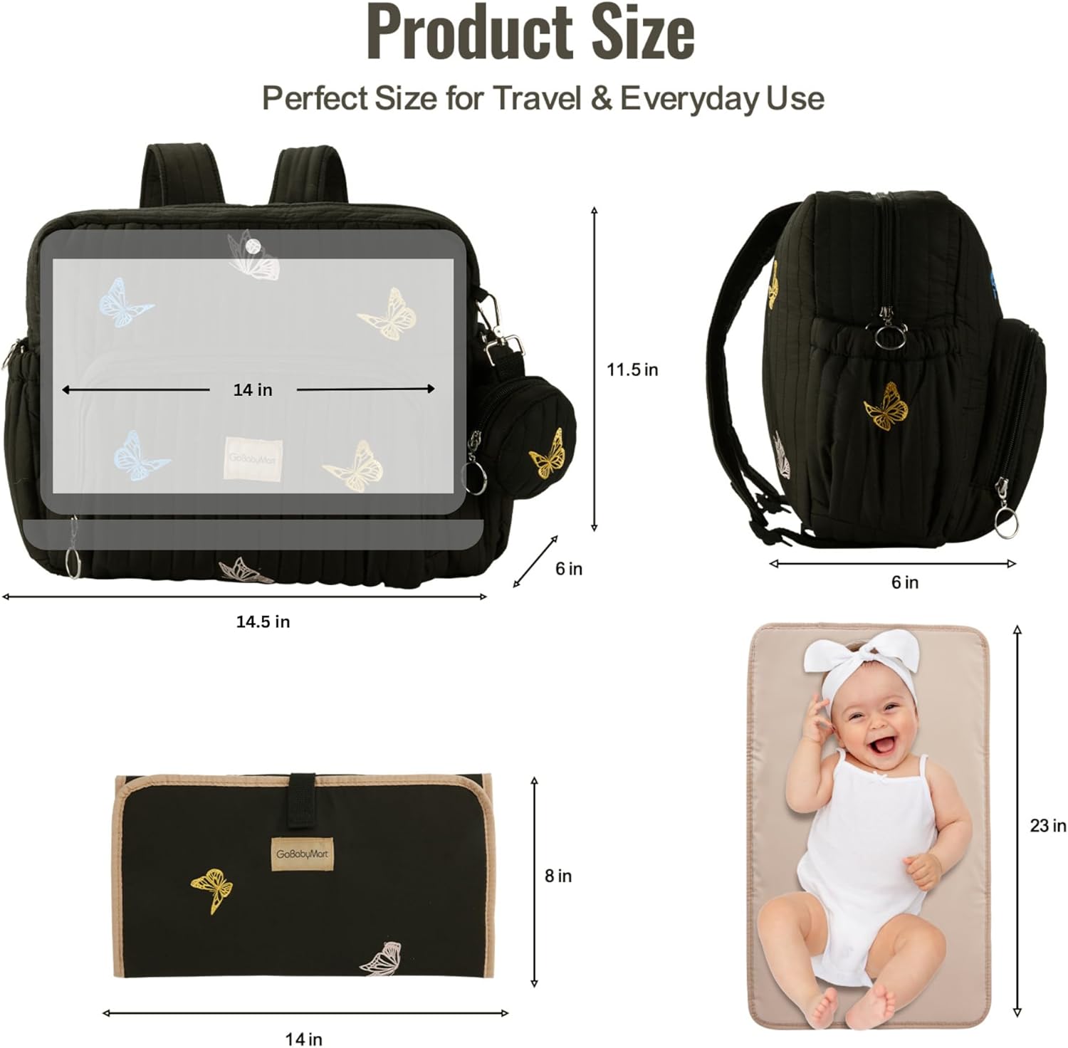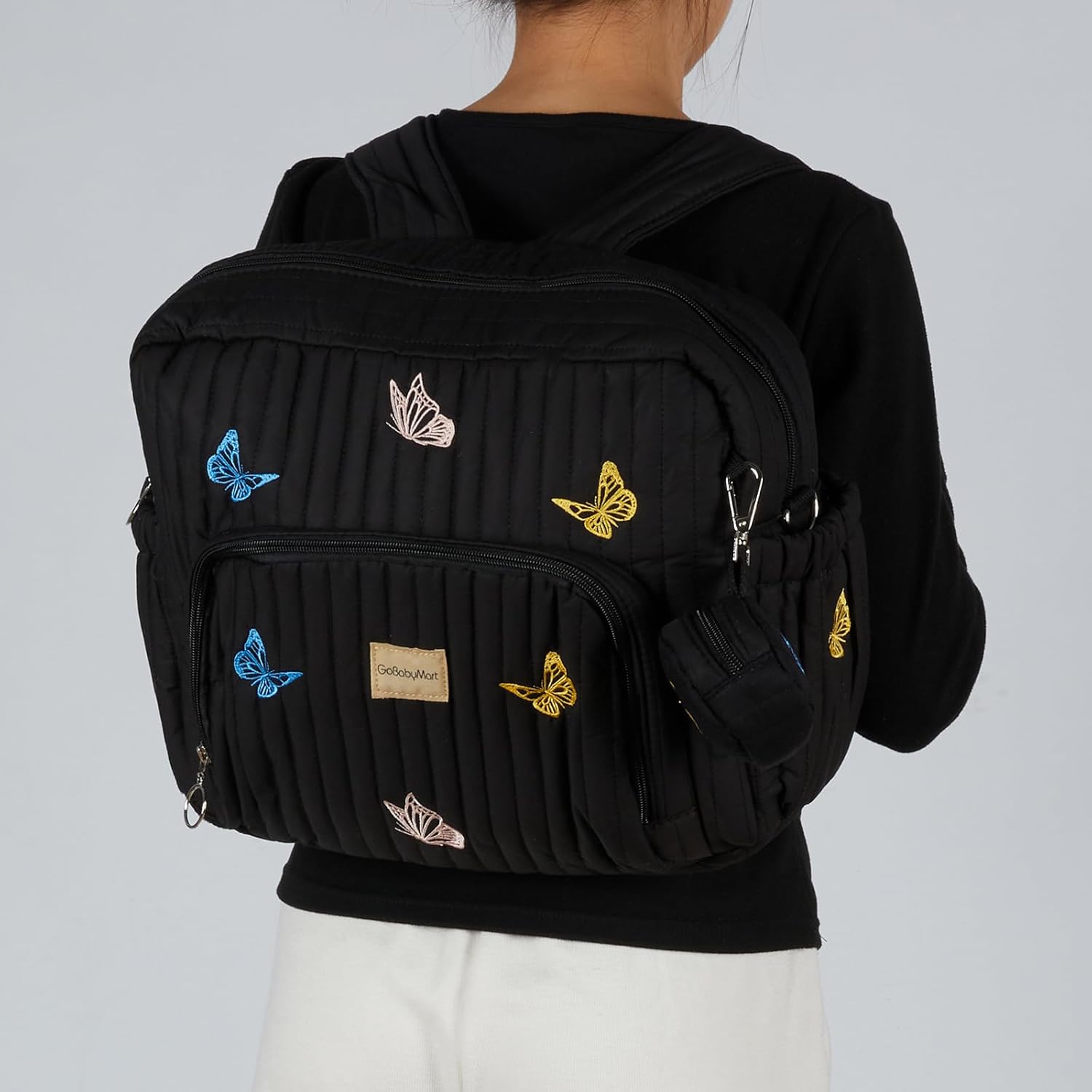 Diaper Bag Backpack, Mini Maternity baby bag with Changing Pad, Insulated Pockets, Stroller Straps & Pacifier Case (Black – Butterflies)