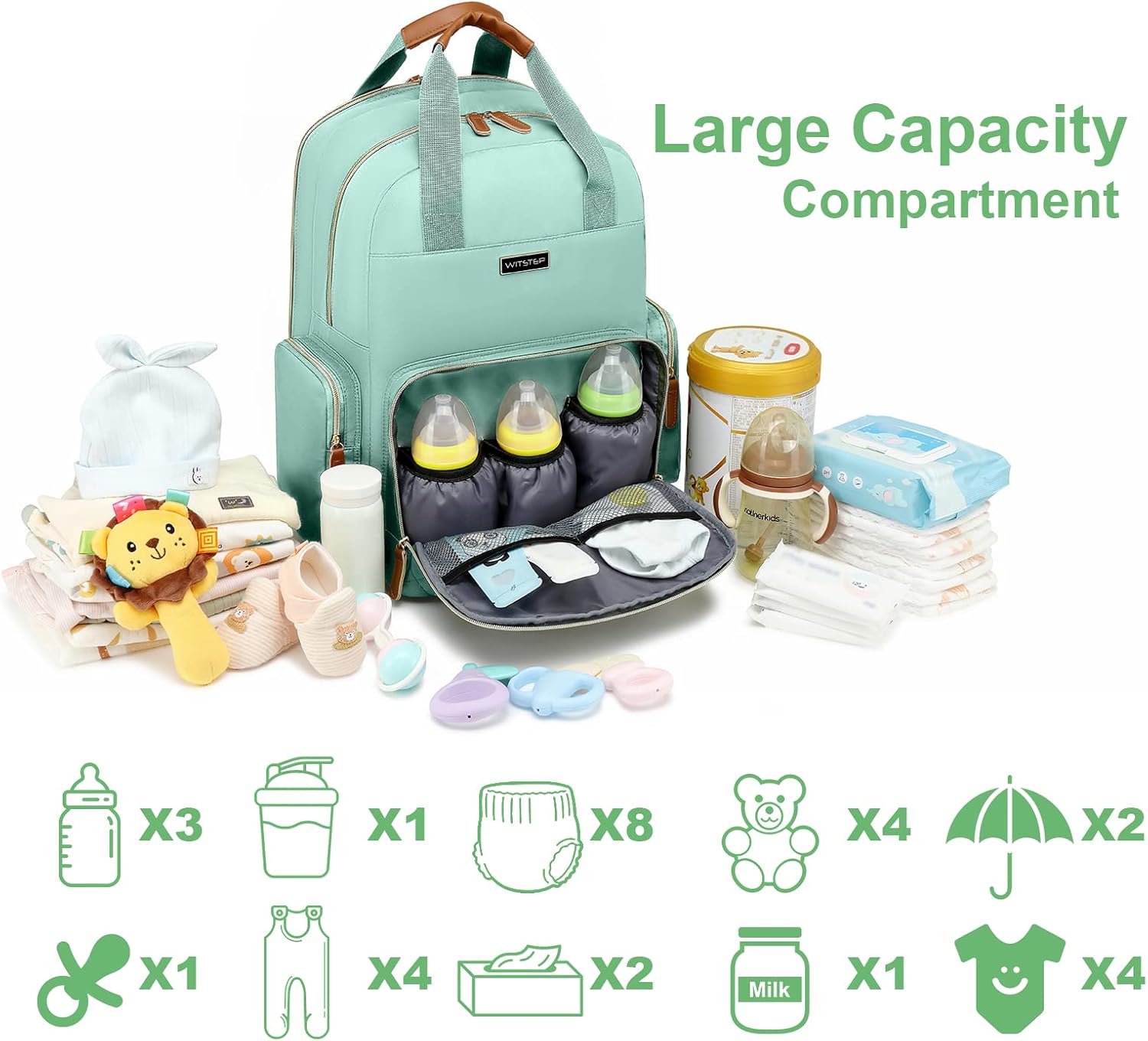The size of baby bag is 15(L)*7.5(W)*19(H) inches.Organize all baby essentials and keep them neat and tidy! Featuring 16 functional pockets to store baby’s diapers, clothes, wipes, toys, and anything baby needs. It includes 3 insulated pockets to keep your baby’s drinks at a warm or cool temperature. With the WITSTEP diaper bag, you can also store your laptop, wallet, car keys, and more!