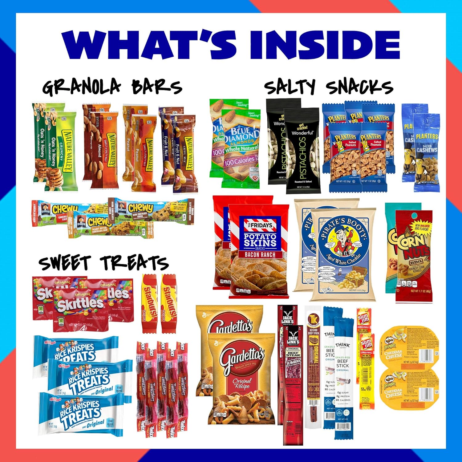 All your favorite name brands in a single variety pack snack box: Nature Valley Bars, Quaker Bars, Motts Gummies, Slim Jim’s, Skittles, Starburst, Twizzlers, Planters Peanuts, Ramen Noodles, Act II Popcorn, Mac & Cheese Cups, Cheeto’s, Fritos, Rice Krispy Treats, Nutrigrain Bars, Think Jerky, and many more! Don’t just choose one brand, choose them all!