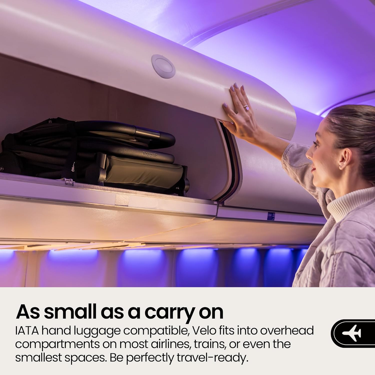 Overhead Friendly: IATA hand luggage compatible, the Velo fits into overhead compartments on most airlines, trains, or even the smallest spaces. Ultra-compact fold: 17x8x20 in