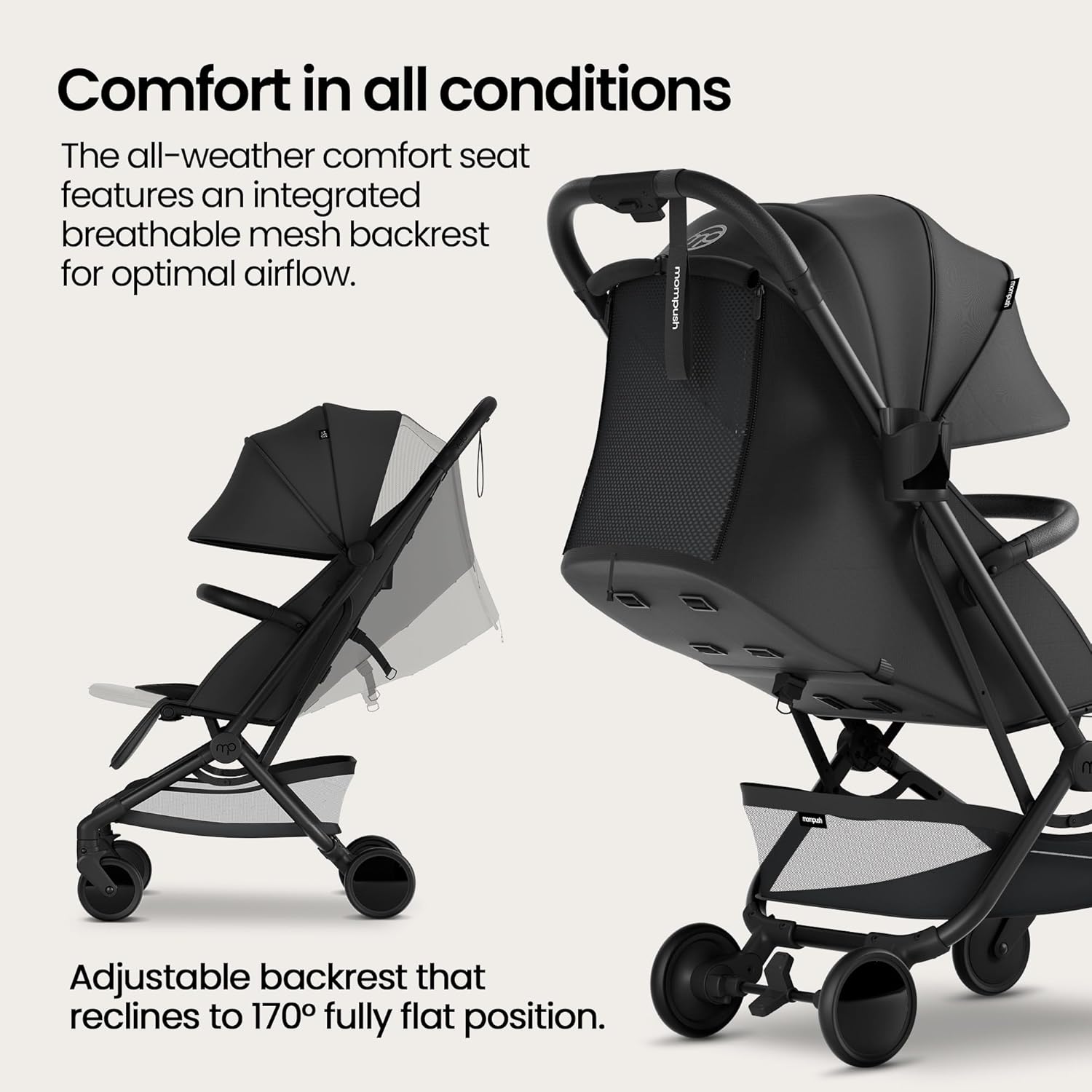 Mompush Velo Lightweight Travel Stroller – One-Hand Fold, Ultra-Compact & Airplane Friendly, Lie-Flat Recline Seat (from Birth to 50 lbs), Includes Cup Holder, Shoulder Strap, and Leather Bumper Bar