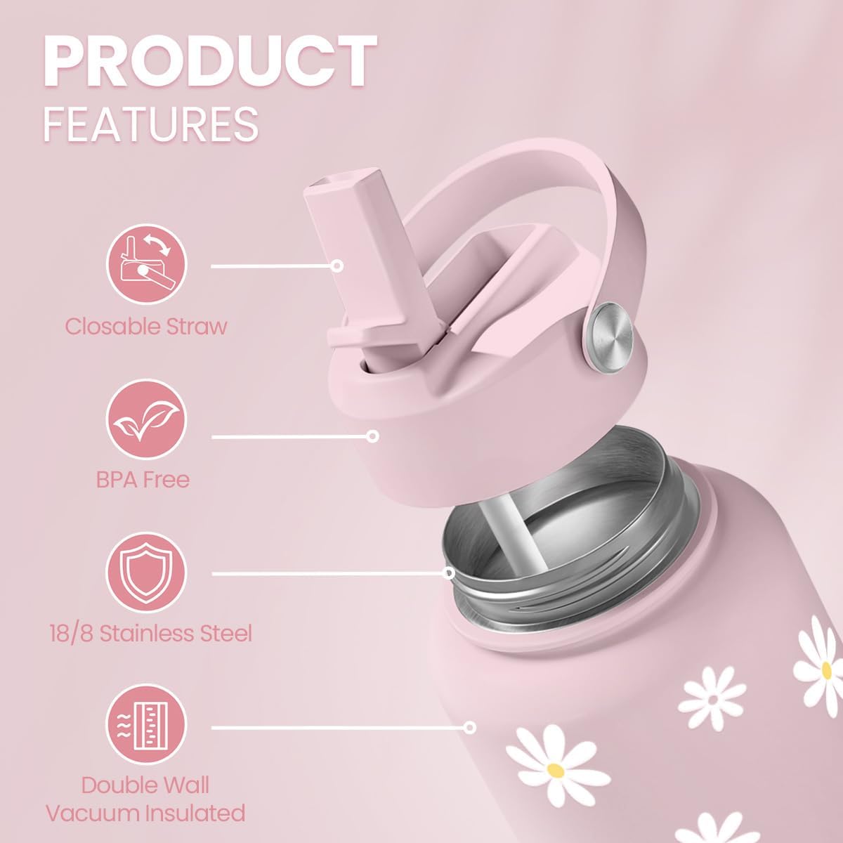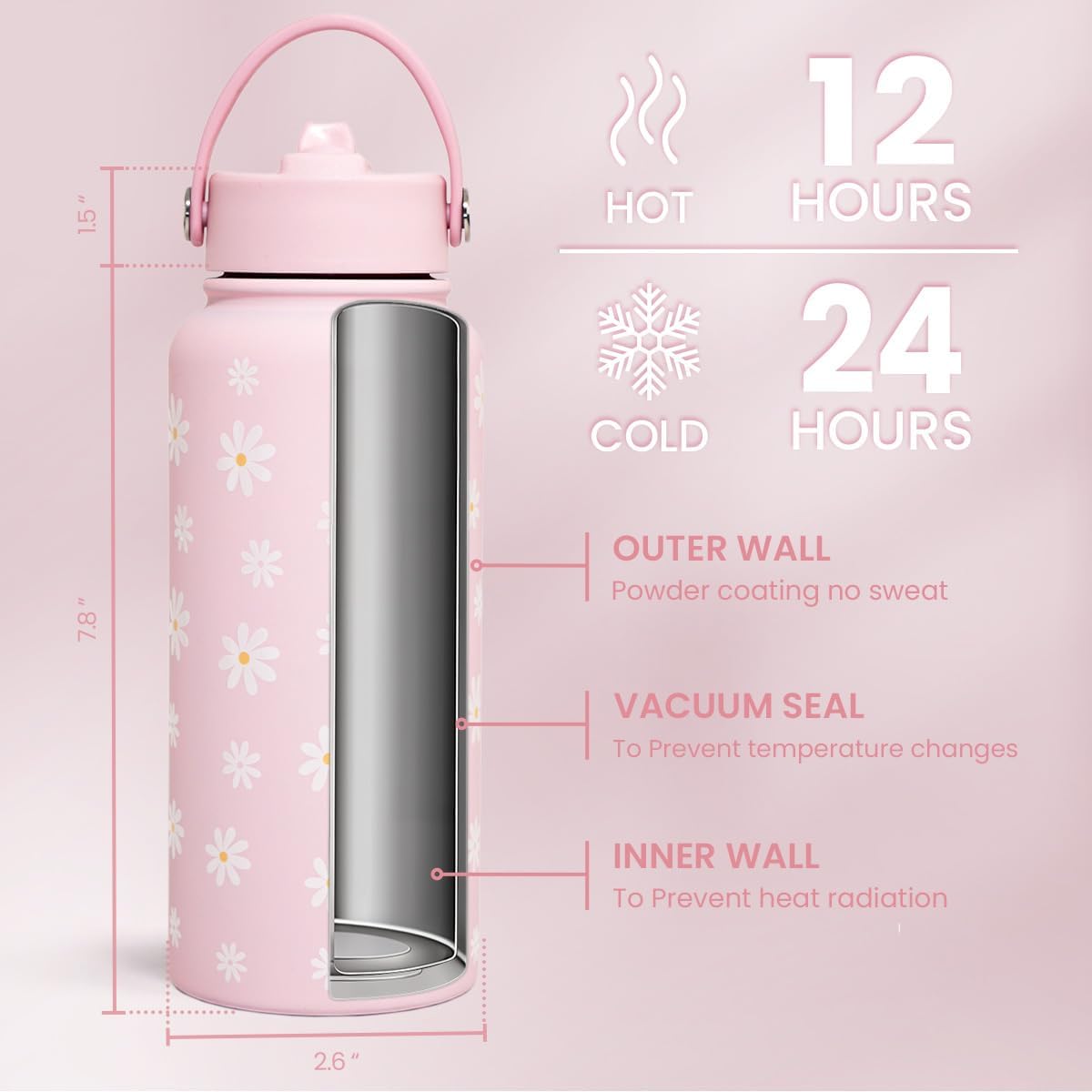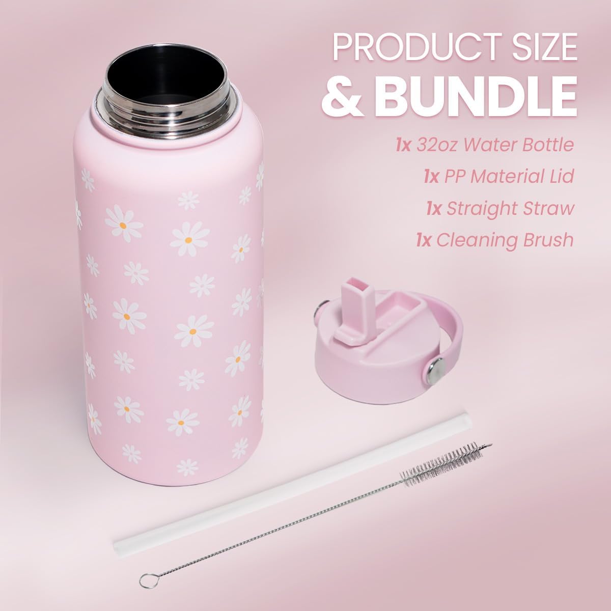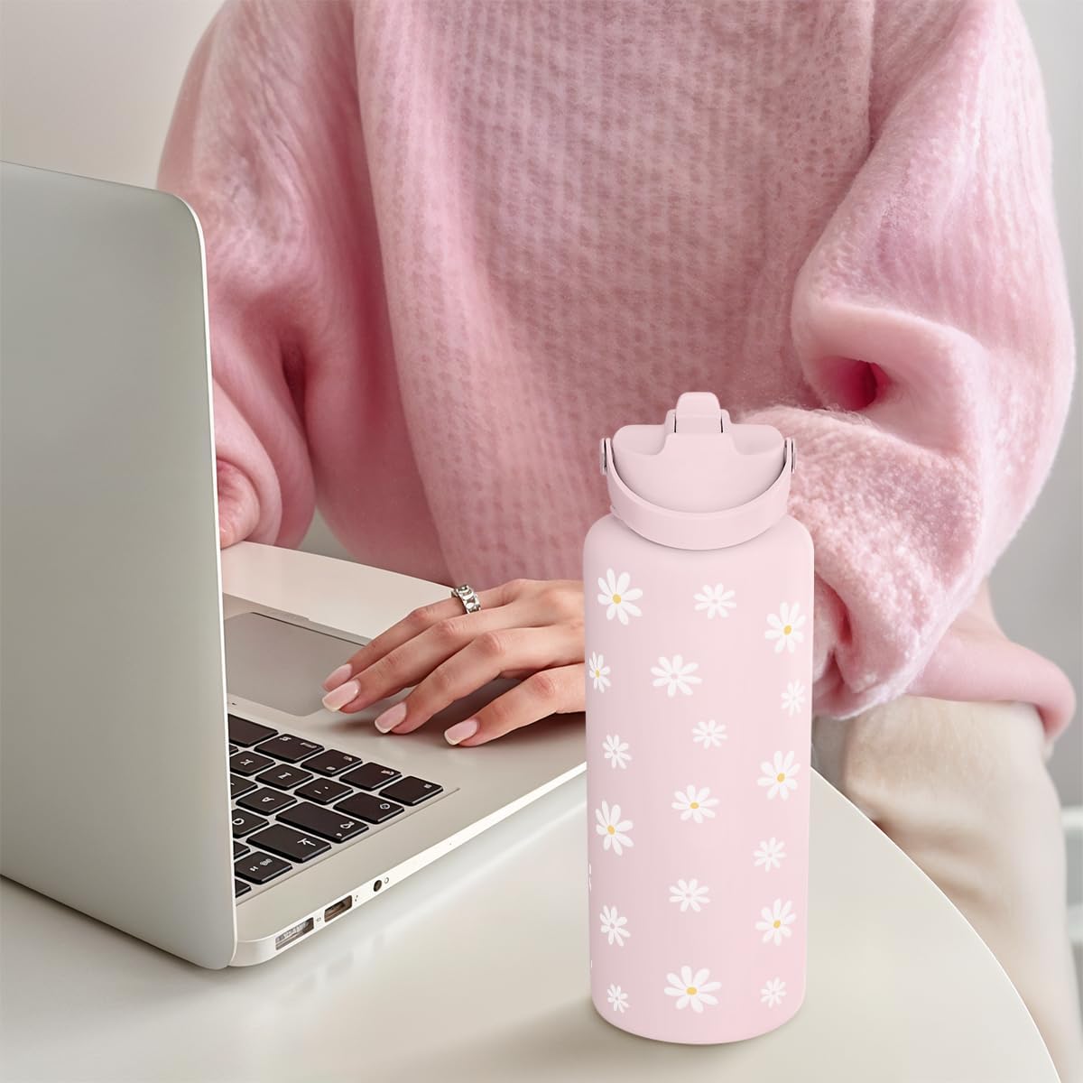 SANDJEST Daisy Water Bottle Stainless Steel 32oz Insulated with Lid, Flower Water Bottles Gifts for Women Girls Friends Teens Birthday Christmas