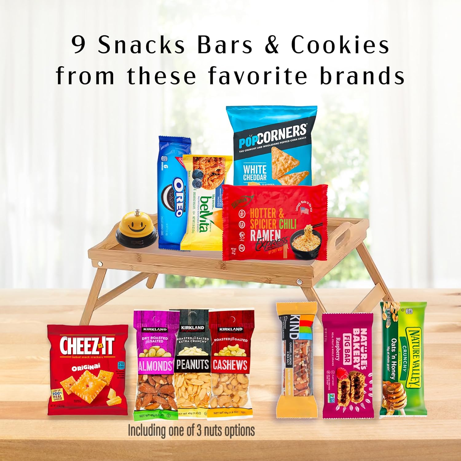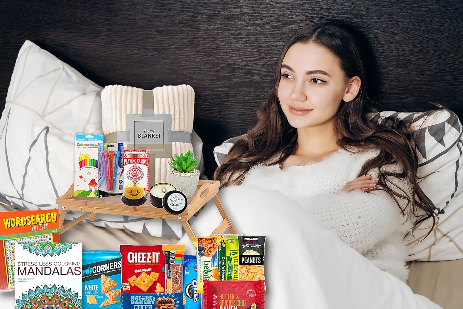 ♥Package including 19 items, Cozy Blanket, Bamboo folding serving bed tray, sour & savory snacks & cookies, Adult coloring book, word search, pencils and colored pencil, Desk Bell, Plant, Candle, Playing cards.